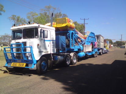 Here is Bell's Huricane and the Crazy Raft being towed by the Ako. Also the Music Trip and the Cha Cha behind the Volvo. Both outside Darwin Showground about to head to Mt Isa. Both using single axle dollies. We do this for the Territory Run. Mt Isa, NT loop. Can't find the picture of the Thunder Bolt set up like this at the moment, will post if I find it soon.
